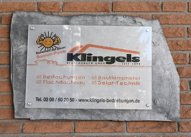 Klingels Bedachungen GmbHDorstener Str. 278 D - 46145 Oberhausen Telefon: 0208 - 60 20 50Telefax: 0208 - 60 20 52E-Mail: K l i n g e l s - B e d a c h u n g e n @ t - o n l i n e . d e